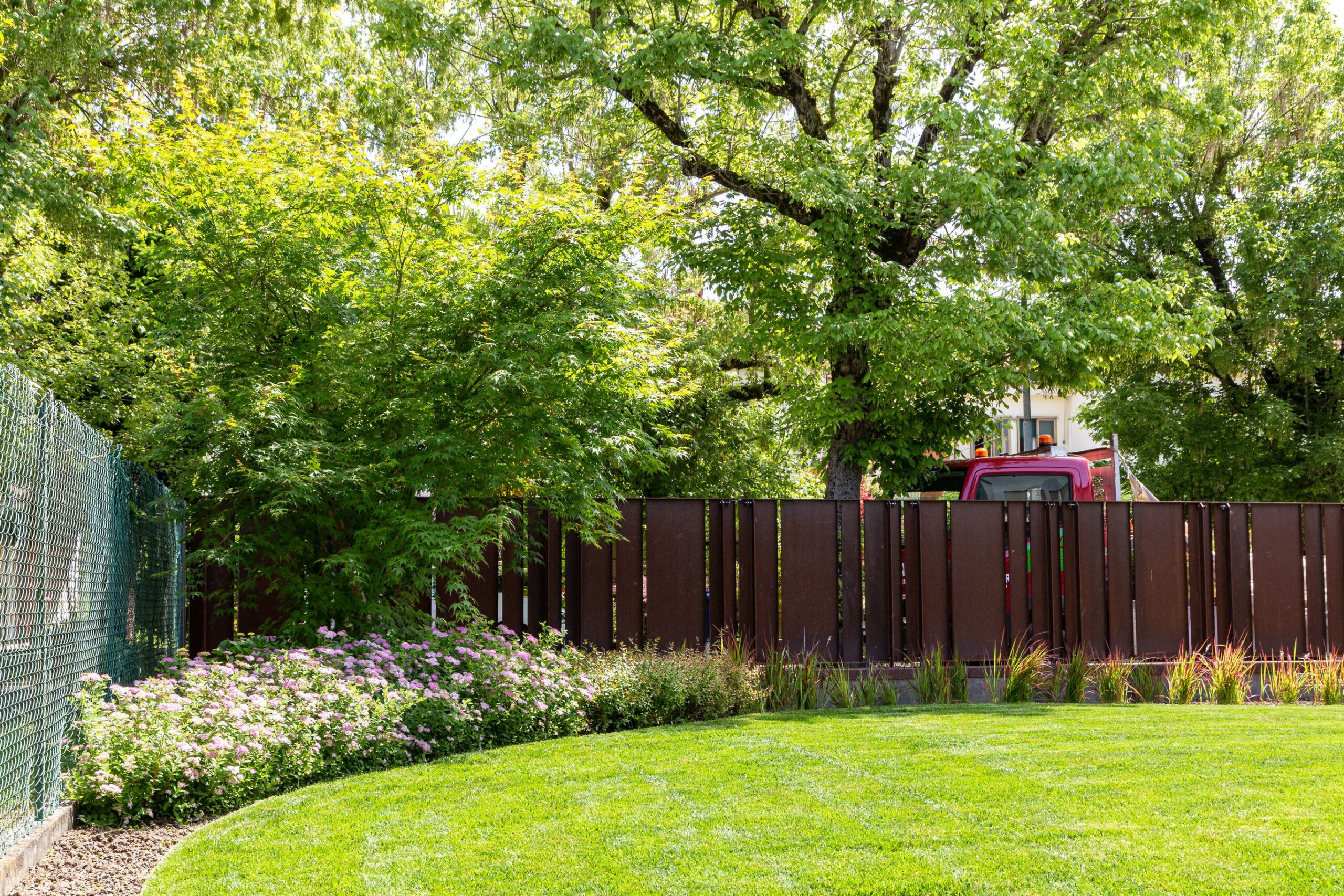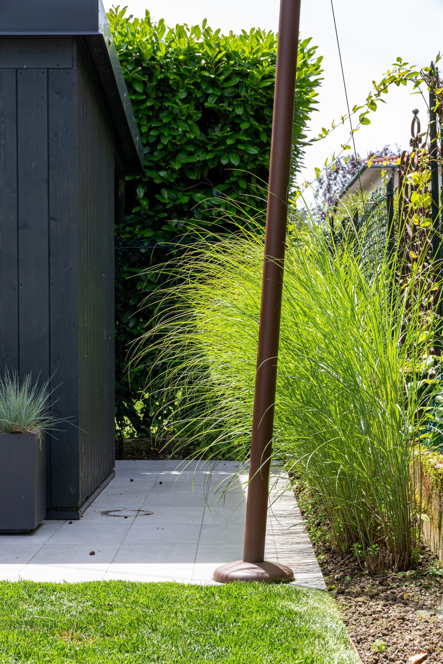 Il progetto si sviluppa su di un’aiuola perimetrale che circonda il perimetro del giardino: un Acer palmatum ed una Lagestroemia indica sono stati posizionati nei punti focali ed una selezione di erbacee perenni è stata inserita per dare il volume sottostante.