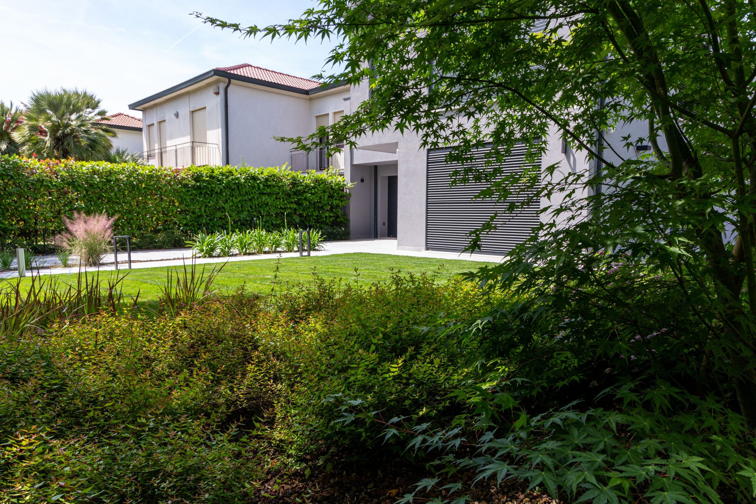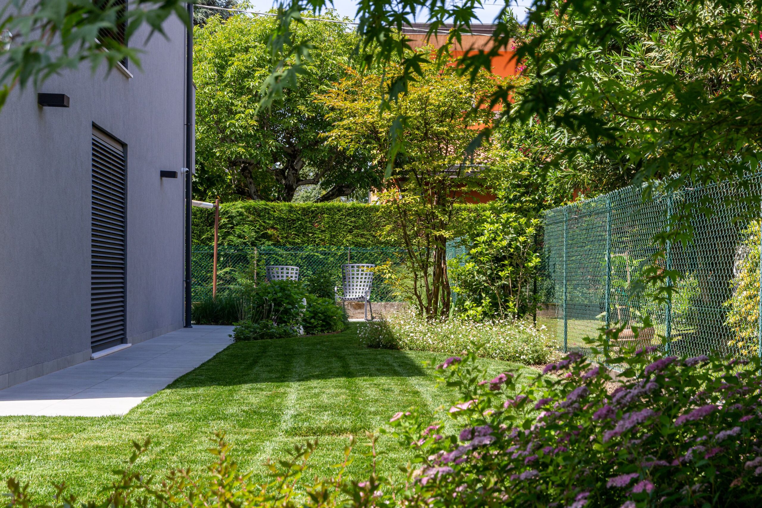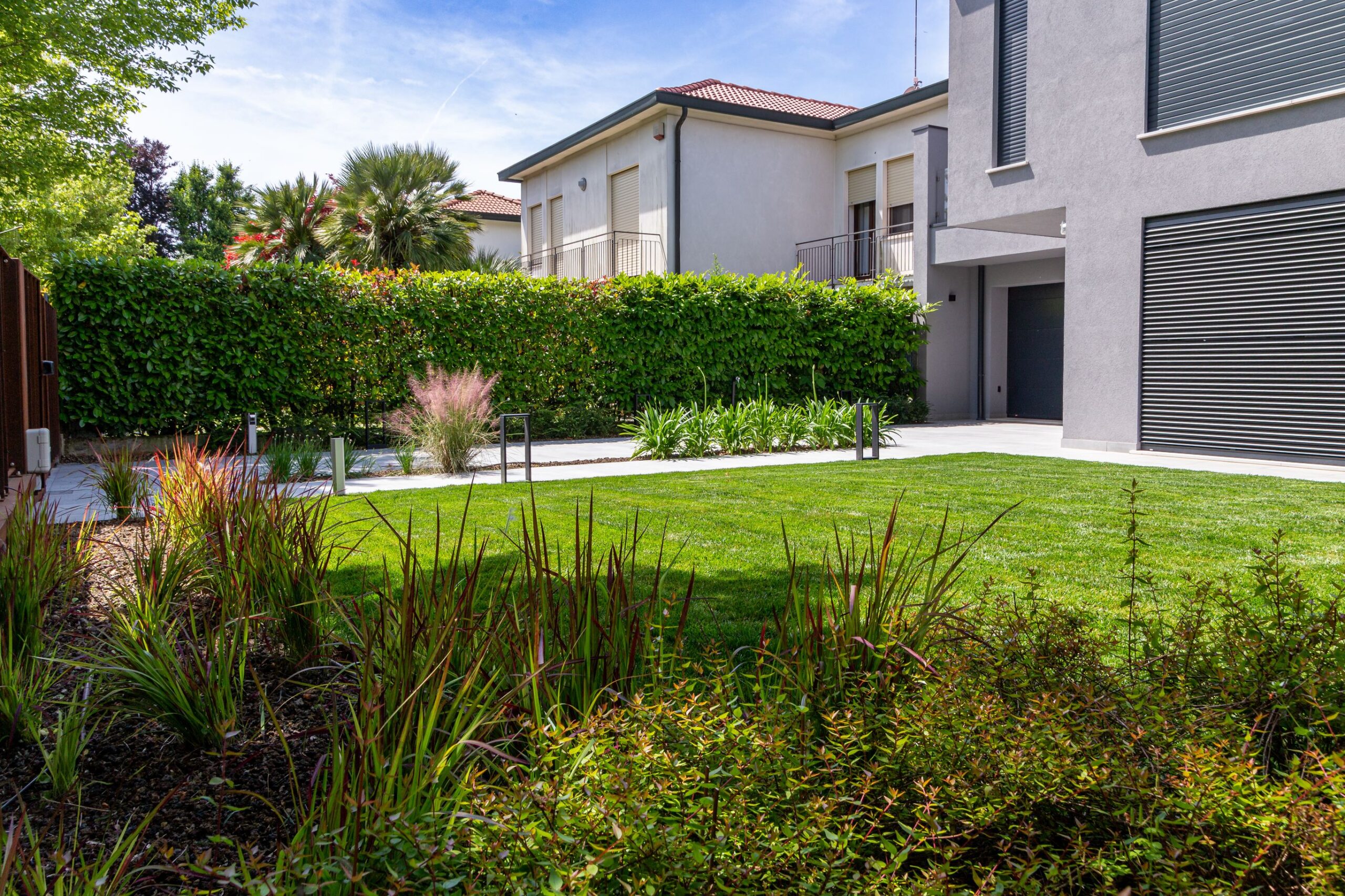 Giardino realizzato su villetta recentemente restaurata, in contesto residenziale.