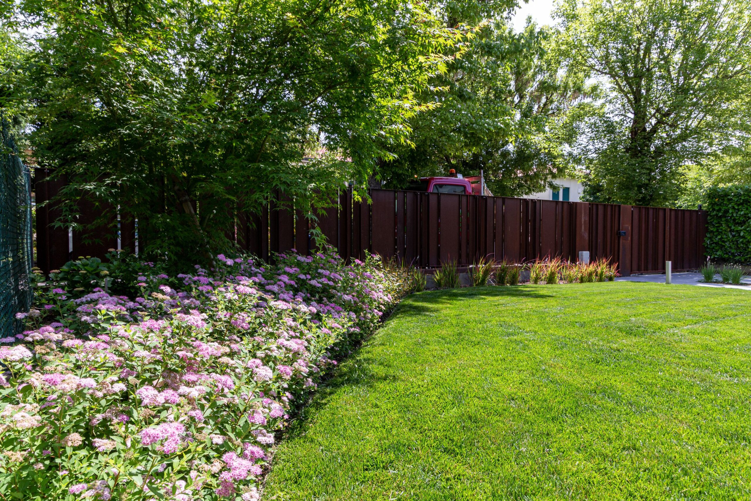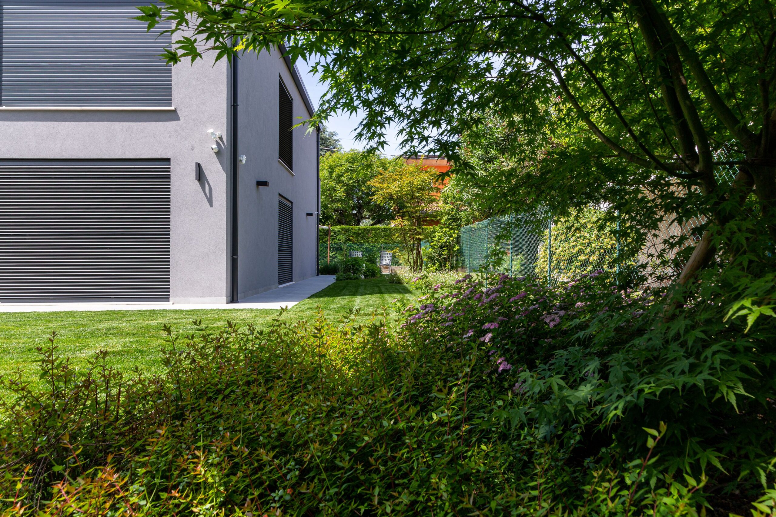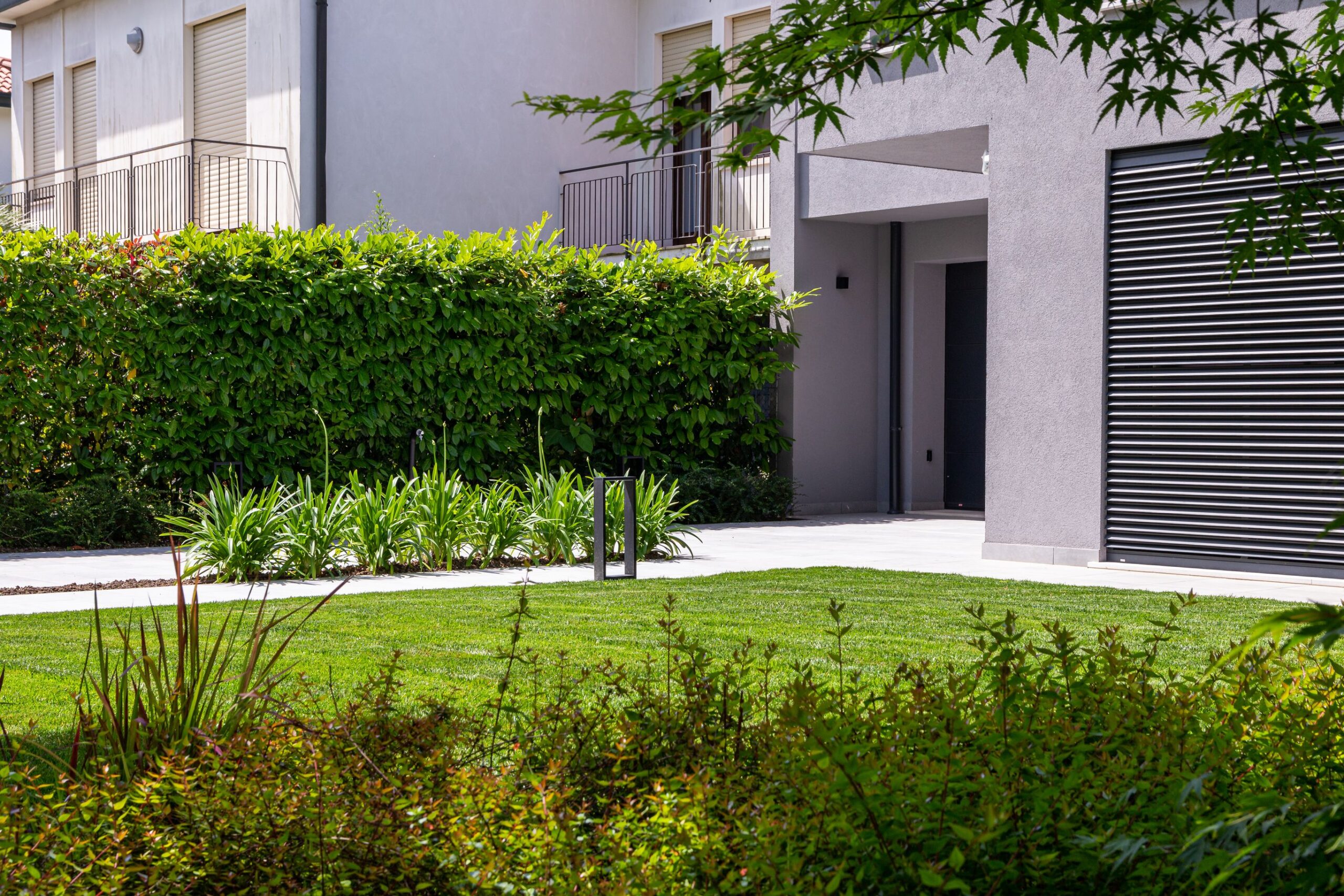 Giardino realizzato su villetta recentemente restaurata, in contesto residenziale.