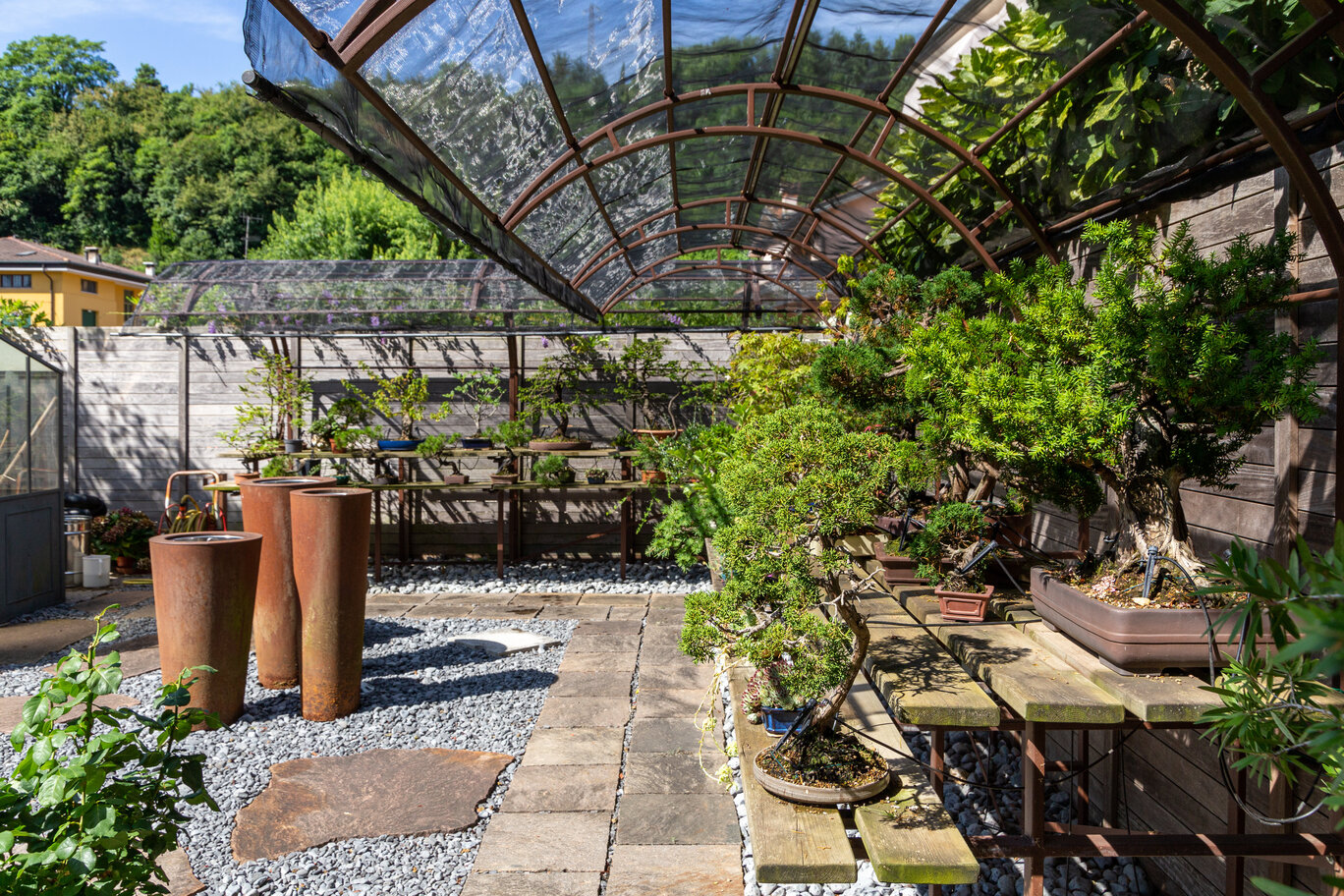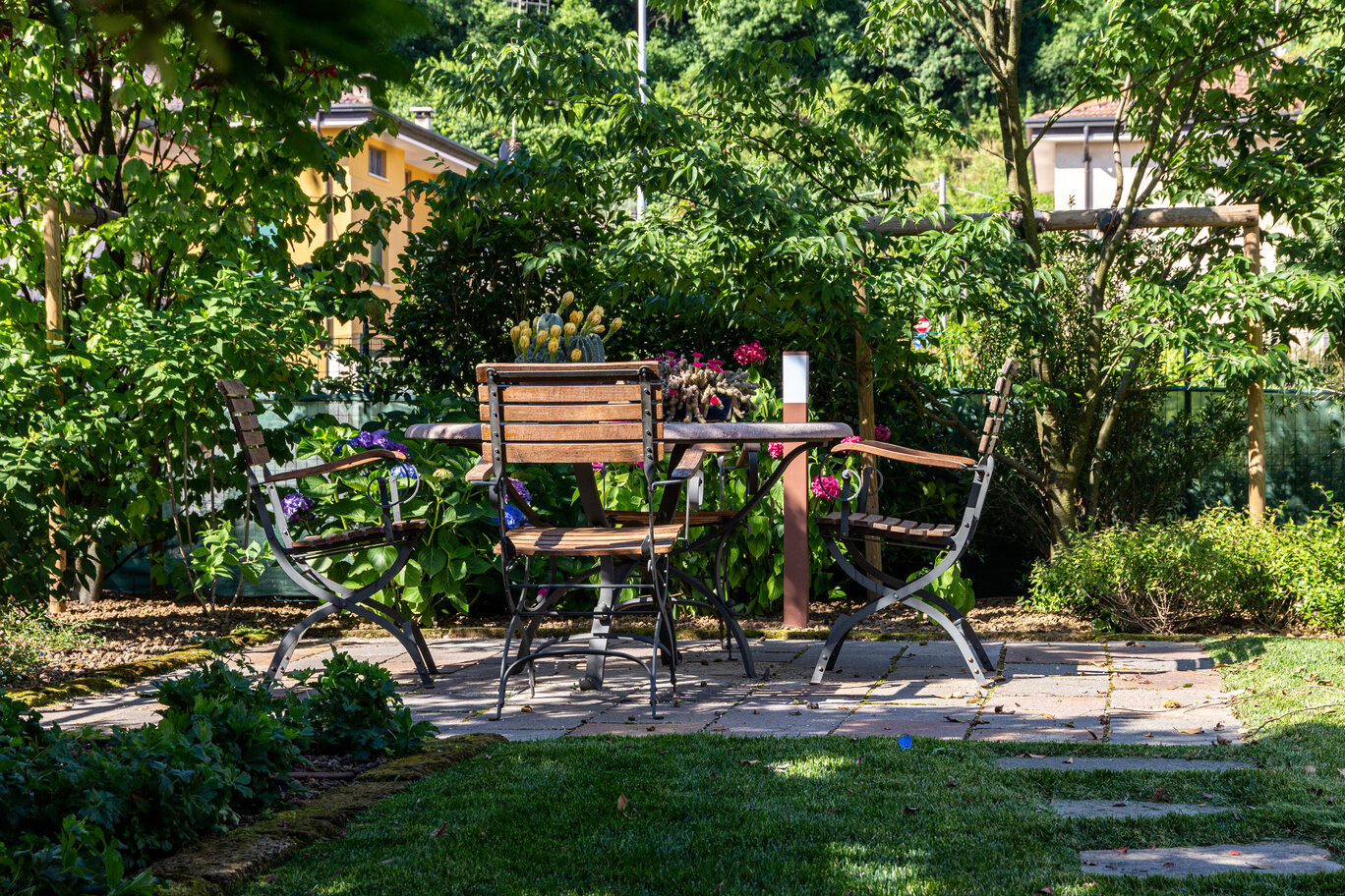 Il progetto ha interessato anche la valorizzazione delle preesistenti aiuole perimetrali, implementandole di molte piante per migliorare l’equilibrio tra i volumi e la privacy complessiva dell’area. E’ stato inserito un camminamento di porfido per mettere in contatto la zona relax con il portico dell’abitazione.